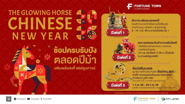 ฟอร์จูนทาวน์ (Fortune Town) ศูนย์รวมไอทีและไลฟ์สไตล์ชั้นนำย่าน รัชดา-พระราม 9 ขนทัพกิจกรรมมงคลมาให้สัมผัส แบบจัดเต็ม เสริมโชค เสริมพลัง ต้อนรับปีม้า ในงาน “The Glowing Horse Chinese New Year 2026” ครบทั้ง ไหว้ ชม ช้อป ที่ ฟอร์จูนทาวน์ รัชดา-พระราม 9