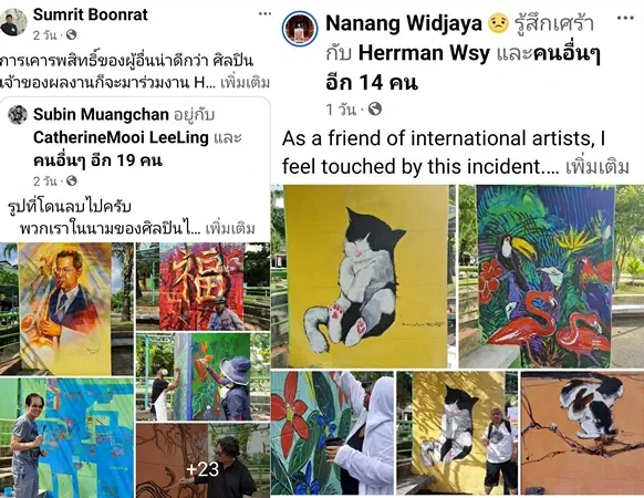 “การที่ผลงานถูกลบออกและวาดทับใหม่เพื่อใช้พื้นที่ทำตลาด ทำให้ศิลปินและเครือข่ายนานาชาติรู้สึกเสียดายเป็นอย่างยิ่ง เนื่องจากผลงานดังกล่าวเป็นผลงานร่วมที่สะท้อนความหวังและพลังใจให้กับเมืองหาดใหญ่ในช่วงเวลาสำคัญ มีเหตุผลสำคัญอย่างไรที่ต้องลบผลงานของศิลปินเหล่านั้นครับ โปรดชี้แจงงให้กับศิลปินทราบด้วยครับ”