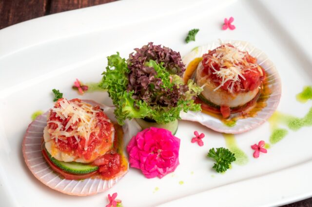 • หอยเชลล์ย่าง เสิร์ฟพร้อมซอสโหระพาและมะเขือเทศ