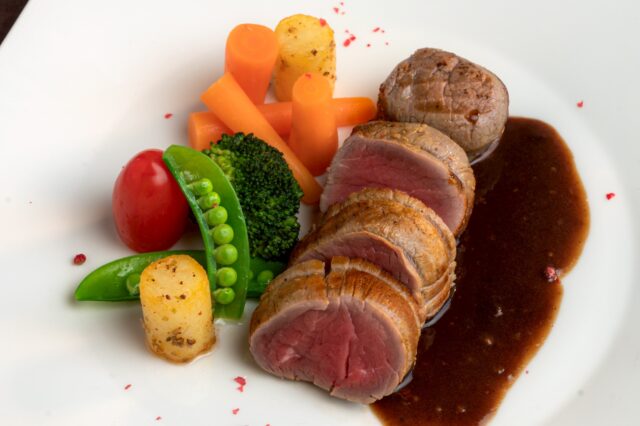 • เนื้อลูกวัวเทนเดอร์ลอยน์ย่าง ซอสพริกไทยดำ