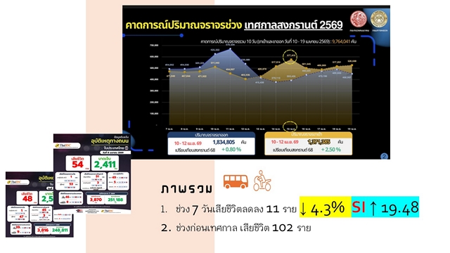 นพ.ธนะพงศ์ จินวงษ์ ผู้จัดการศูนย์วิชาการเพื่อความปลอดภัยทางถนน (ศวปถ.) กล่าวว่าข้อมูลสถานการณ์อุบัติเหตุช่วงสงกรานต์โดย ศูนย์อำนวยการป้องกันและลดอุบัติเหตุทางถนนช่วงเทศกาลสงกรานต์ ปี 2569 เทียบกับปี 2568 ว่า แม้ราคาน้ำมันแพงแต่การเดินทางเพิ่มขึ้น 0.8% ขณะที่อุบัติเหตุรวม 1,242 ครั้ง ลดลง 19.25% ผู้บาดเจ็บ 1,200 คน ลดลง 19.75% และเสียชีวิต 242 ราย ลดลง 4.35% อย่างไรก็ตาม ดัชนีความรุนแรงเพิ่มขึ้น โดยจากอุบัติเหตุ 100 ครั้ง มีผู้เสียชีวิตเพิ่มจาก 16 คน เป็น 19.48 คน โดยจังหวัดที่เกิดอุบัติเหตุสะสมสูงสุดคือ จ.แพร่ 48 ครั้ง และมีผู้บาดเจ็บสะสมสูงสุด 50 คน ขณะที่กรุงเทพมหานครมีผู้เสียชีวิตสะสมมากที่สุด 21 ราย รองลงมาคือ จ.ปทุมธานี 12 ราย สาเหตุหลักของอุบัติเหตุ ได้แก่ ขับรถเร็ว 40.65% ตัดหน้ากระชั้นชิด 25.20% และดื่มแล้วขับ 24.39% พฤติกรรมเสี่ยงสูงสุด ได้แก่ ไม่ใช้อุปกรณ์นิรภัย โดย 55.00% ไม่สวมหมวกนิรภัย รองลงมาคือขับรถเร็ว 25.71% และดื่มแล้วขับ 18.57% ประเภทรถที่เกิดเหตุสูงสุดคือรถจักรยานยนต์ 64.55% รองลงมารถกระบะ 15.34% จุดเกิดเหตุ 47.15% เป็นถนนขององค์กรปกครองส่วนท้องถิ่น และ 44.72% เป็นถนนกรมทางหลวง โดย 87.80% เกิดบนถนนทางตรง