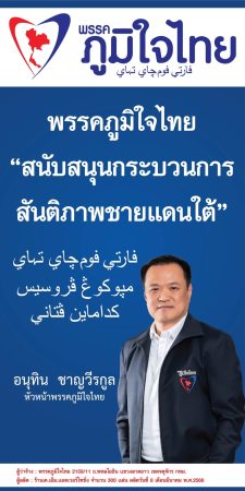 นอกจากนี้ภูมิใจไทย ยังมีนโยบายในการต้องการเห็นการแก้ปัญหาความไม่สงบในจังหวัดชายแดนภาคใต้ที่ กินเวลายาวนานถึง 20 ปี ด้วยการนำเสนอนโยบายด้วยการ”สนับสนุนกระบวนการ ทั้งการลดความรุนแรงในพื้นที่ การเยียวยาผู้ที่ได้รับผลกระทบ และการพูดคุยสันติสุข ระหว่างขบวนการแบ่งแยกดินแดน กับตัวแทนของรัฐบาล ที่มีผู้แทนของรัฐบาลมาเลเซียเป็นผู้อำนวยความสะดวก