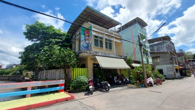 มองจากด้านนอกตัวร้านเป็นตึกแถวที่ตั้งอยู่ริมถนนในซอยกลางเมืองเบตง สามารถจอดรถริมถนนได้เลย ร้านทาด้วยสีเหลือเป็นบ้านเก่าแบบโบราณกว่า 40ปี ตกแต่งออกวินเทจ เป็นแบบโอเพ่นแอร์ มีโต๊ะนั่งหลายโต๊ ทั้งภายในร้านและสวนข้างนอก บรรยากาศเย็นสบายร่มรื่นได้ลมจากริมคลองเบตงด้วยแล้วร้อนๆบอกเลยว่าฟินสุด