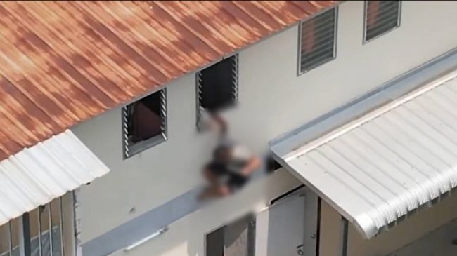 ภาพนาทีที่สารวัตรกานต์สันติบาลจนมุมพยามจะทุบกนะจกบานเกร็ดเพื่อเปิดทางหลบหนี แต่ตกลงมาจากชั้น2ด้านหลังของตัวบเาน ลงมานอนกองกับพื้น ก่อนที่จะถูกชาร์จจับกุมตัว