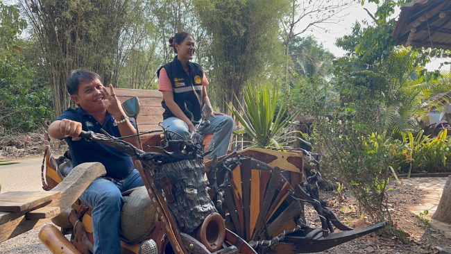 ด้านนายกฯกัมปนาท ชูสุวรรณ นายกองค์การบริหารส่วนตำบลเกาะขนุน พร้อม นส.อรุณรัตน์ แก้วโรจน์ ผู้ใหญ่บ้าน หมู่ที่ 7 บ้านท่าไทร คนสวย ภูมิใจในสิ่งประดิษฐ์ที่ช่างจ๊อดประดิษฐ์ขึ้นจากเศษไม้ต่างๆ นั่งนิ่ม สบาย พร้อมจะต่อยอดให้เป็นศูนย์การเรียนรู้ประจำชุมชน ขณะที่ผู้สื่อข่าว ไม่รอช้าทดสอบขับโดยให้ผู้ใหญ่บ้านคนสวยนั่งพาชมท้องถิ่น และต้องยอมรับในฝีมือของพี่เธนตร สบายกาย หรือช่างจ๊อด ที่สร้างงานศิลปะหนึ่งเดียวในโลกนี้ และยังพร้อมเป็นอาจารย์ให้ความรู้สู่คนในชุมชนและคนทั่วไป……….