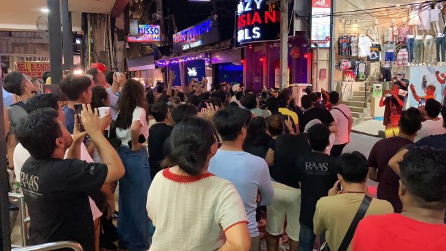 เมื่อเวลา 01.00 น.วันที่ 28 เมษายน 2566 ร.ต.อ.สนธยา ขนทรัพย์ รอง สวป.สภ.เมืองพัทยา รับแจ้งเหตุ มีบุคคลปีนขึ้นไปอยู่บนที่สูง เหตุเกิดที่ร้านโมต้า เทเลอร์ ภายในถนนคนเดินวอล์กกิ้ง สตรีท พัทยาใต้ เลขที่ 235/10-11 ต.หนองปรือ อ.บางละมุง จ.ชลบุรี หลังรับแจ้งจึงประสานเจ้าหน้าที่กิจการพิเศษเมืองพัทยา เจ้าหน้าที่กู้ภัยสว่างบริบูรณ์ธรรมสถานเมืองพัทยา รีบนำลังไปตรวจสอบที่เกิดเหตุพบนักท่องเที่ยวทั้งชาวไทยและชาวต่างประเทศ มุงดูเหตุการณ์จำนวนมาก ด้วยความแตกตื่น