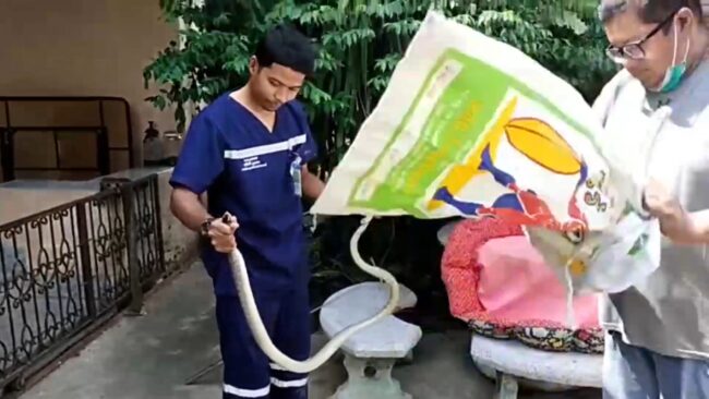 วันนี้ 24 พฤษภาคม 2566 ที่ อ.นาทวี จ.สงขลา ขณะที่ นางปฐมา เสนะพันธ์ อายุ 58 ปี ที่อยู่บ้านเลขที่ 48 ม.4 ถ.รัตนวิถี ต.นาทวี อ.นาทวี กำลังเดินอยู่ภายในบริเวณบ้านเลขที่ดังกล่าว ทันใดสายตาก็มองไปเห็นงูเลื้อยเข้าไปในห้องเก็บของหลังบ้าน ตนคิดว่าเป็นงูจงอาง หลังตั้งสติได้ จึงรีบโทรแจ้งเจ้าหน้าที่อสรพิษวิทยาภาคใต้ฯให้มาช่วยจับงู