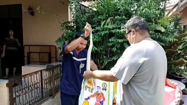ผวา นึกว่า จงอางเลื้อยเข้าบ้าน แจ้ง จนท.อสรพิษวิทยาฯมาจับ กลายเป็น งูสิงหางลาย