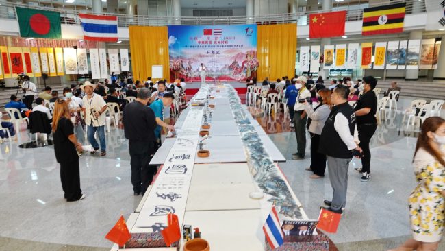 บรรยากาศของนิทศรรศการศิลปะ ไทย-จีน “One Belt and One Road Global Art Tour” ครั้งที่ 20 มีผู้ที่ชื่นชอบศิลปะ นักวิชาการ และสมาชิกในชุมชนท้องถิ่น ตัวแทนเครือข่ายศิลปะในประเทศไทย 3 สถาบัน ได้แก่ 1. มหาวิทยาลัยศิลปากร 2.มหาวิทยาลัยเทคโนโลยีราชมงคลธัญบุรี และ 3.มหาวิทยาลัยธุรกิจบัณฑิต ร่วมโชว์ผลงานจิตรกรรมจากประเทศจีนและประเทศไทย เป็นสัญลักษณ์ของความสัมพันธ์อันแน่นแฟ้นระหว่างมหาวิทยาลัยและชุมชนศิลปะของทั้งสองประเทศ และเป็นการนำเสนอการแสดงออกทางศิลปะและมุมมองที่หลากหลาย ผู้เข้าชมนิทรรศการมีโอกาสสัมผัสโลกแห่งศิลปะไทยและจีนที่มีชีวิตชีวา และความลุ่มลึกของทั้งสองวัฒนธรรม โดยเน้นที่เทคนิค ธีม และลวดลายทางวัฒนธรรมอันเป็นเอกลักษณ์ที่แยกความแตกต่างของศิลปะไทยและจีน