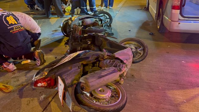 จยย. ชนกันสนั่นกลางแยกสัตหีบ บาดเจ็บสาหัสเต็มถนน