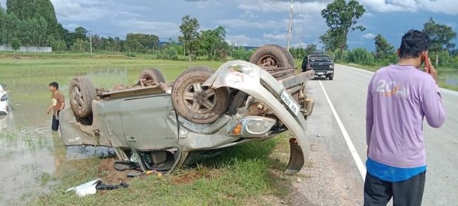 ร้อยเอ็ด…ชนสนั่น เก๋ง+กระบะขนแรงงานรับจ้างปักดำ หงายท้องล้อชี้ฟ้า มีผู้ได้รับบาดเจ็บหลายราย