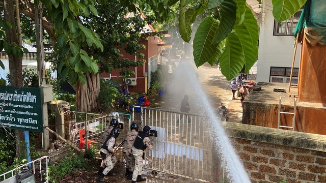 แต่ปรากฏว่าเมื่อกำลังตำรวจ-ทหาร- -ฝ่ายปกครอง- อส. เดินทางไปถึงก็พบว่าประตูทางเข้าวัดหลวงพ่อเงินบางคลานทุกจุดถูกกลุ่มอันธพาลและชาวบ้านปิดประตูสกัดกั้นไม่ให้เจ้าหน้าที่เข้าไป โดยไม่เชื่อฟังคำสั่งของฝ่ายปกครองที่ชี้แจงเหตุผลว่า การกระทำที่ชาวบ้านเข้ายึดวัดหลวงพ่อเงินบางคลานในลักษณะนี้เป็นการกระทำที่ผิดกฎหมาย กลุ่มชาวบ้านซึ่งแท้ที่จริงเป็นพวกรับจ้างมาป่วนในวัดหลวงพ่อเงินบางคลานก็เริ่มใช้หนังสติ๊กยิงใส่กำลังของ ตำรวจ-อส.-ฝ่ายปกครอง จนโล่ที่ใช้กำบังควบคุมฝูงชนแตกเสียหาย รวมถึงได้รับบาดเจ็บไปตามๆกัน เมื่อการเจรจาไม่ได้ผลกำลัง ตำรวจ-อส.-ฝ่ายปกครอง จึงต้องใช้รถดับเพลิงฉีดน้ำใส่ฝูงชนที่มีประมาณเกือบ 100 คน ที่เฝ้าประตูในแต่ละจุด