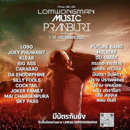 วันที่ 8 ธ.ค.ร็อคเกอร์สาวเสียงทรงพลัง “ดา เอ็นโดรฟิน” – ปรางปรางทิพย์ วันที่ 9 ธ.ค.สาวน้อยเสียงดี แซ่บ ขยี้ใจ “มีนตรา อินทิรา” ที่จะมาฟาดความเผ็ดไฟลุกท่วมเวที – เอกชัย ศรีวิชัย ล้อมวงเต้นเมดเล่ย์ ริมทะเลปากน้ำปราณ “เสือ สองเล” ที่จะมาระเบิดพลังเพลงฮิตแบบไม่ยั้ง และวันที่ 10 ธ.ค.ปิดเวที “ล้อมวงมันส์ ปากน้ำปราณ” กับร็อคเกอร์สาวขาร็อคที่ทุกคนรอคอย “ใหม่ เจริญปุระ” นอกจากนี้ภายในงานยังมีร้านค้ามากกว่า 200 ร้าน ขบวนฟู้ดทรัคให้ทุกท่านได้อิ่ม อร่อย บริเวณลานด้านหน้าชายทะเล ติดตามข่าวสารได้ที่เฟซบุ้ค ล้อมวงมันส์ Fun Network ซื้อบัตรล่วงหน้าผ่านระบบ Line Official : @lomwongmans หรือซื้อบัตรหน้างานที่ลานมหาราช ริมทะเลปากน้ำปราณ จ.ประจวบฯ.