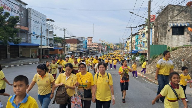 เบตง ข้าราชการ ประชาชน นักเรียน กว่า 500 คน สวมใส่เสื้อสีเหลือง ร่วมกิจกรรมเดิน วิ่ง ปั่น ธงตราสัญลักษณ์งานเฉลิมพระเกียรติพระบาทสมเด็จพระเจ้าอยู่หัว เนื่องในโอกาสพระราชพิธีมหามงคลเฉลิมพระชนมพรรษา 6 รอบ 28 กรกฎาคม 2567
