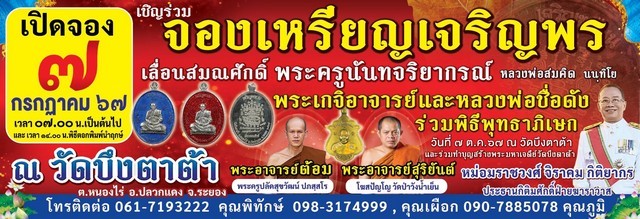 เปิดจองวันที่ 7 กรกฎาคม 2567 เวลา 07.00 น.เป็นต้นไป และเวลา 14.00 น. พิธีตอกพิมพ์นำฤกษ์ เหรียญเจริญพรเลื่อนสมณศักดิ์พระครูนันทจริยาภรณ์(หลวงพ่อสมคิด นนฺทิโย) ในพิธีมีพระเกจิอาจารย์ชื่อดังร่วมพิธีพุทธาภิเษกมากมาย อาทิ พระอาจารย์ สุริยันต์ โฆสปัญญา วัดป่าวังน้ำเย็น ฯลฯ โดยมี หม่อมราชวงศ์จิราคม กิติยากร ประธานกิติมศักดิ์ ฝ่ายฆาราวาส ขอเชิญร่วมทำบุญสร้างพระมหาเจดีย์วัดบึงตาต้า ณ วัดบึงตาต้า ต.หนองไร่ อ.ปลวกแดง จ.ระยอง