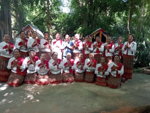 ในการทำบุญเบิกบ้าน ได้ร่วมกับลูกหลาน เยาวชน ก่อเจดีย์ทราย ตบประทาย ปักธงสี โรยแป้ง และสักการะศาลปู่หอใต้หอเหนือ พร้อมน้อมจิตอธิษฐานขอพรตามความเชื่อ เนื่องจากศาลปู่หอใต้หอเหนือเป็นสิ่งศักดิ์สิทธิ์ ที่ชาวบ้านนับถือมาช้านาน เป็นที่พึ่งทางใจอีกแห่งหนึ่งของชาวบ้านตูม โดยในวันนี้ตนยังได้อธิษฐานขอให้ลูกหลาน ชาวบ้านตูมทุกคน อยู่เย็นเป็นสุข ปราศจากความทุกข์ใดๆทั้งปวง นอกจากนี้ ยังบนบานขอให้ฝนตกต้องตามฤดูกาล เพื่อที่ลูกหลานจะได้มีน้ำท่าในการประกอบอาชีพทำนาและเลี้ยงกุ้งก้ามกราม ซึ่งเป็นอาชีพหลักของชาวบ้านตูม