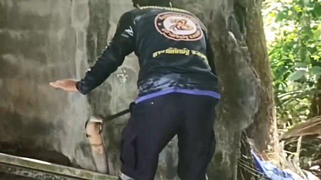 วันนี้ฯ ขณะที่ นายทวีศักดิ์ บุญเศษ เจ้าหน้าที่ทีมปราบอสรพิษอาสาพิทักษ์งู จ.สงขลา และ กู้ชีพ อบต.สะท้อน กำลังปฎิบัติหน้าที่อยู่ในพื้นที่ อ.นาทวี จ.สงขลา ก้ได้รับแจ้งจากนาย นราธิป มโนเรศน์ อายุ 37 ปี อยู่ ลานปาล์ม นาทวีสาขา 2 เลขที่ 44/7 ม.2 ต.ทับช้าง อ.นาทวี จ.สงขลา ว่ามีงูจงอางยักษ์ ขดตัวอยู่ข้างเปลที่คนงานกำลังนอนเล่นโทรศัพท์ คนงานเล่าว่าได้ยินเสียงดังแกรกๆเลยหันไปดูก็พบงูจงอางยักษ์ ด้วยความตกใจรีบกระโดดออกจากเปลวิ่งหลบไป ส่วนงูก็ได้เลื้อยเข้าไปแอบในห้องน้ำเก่า