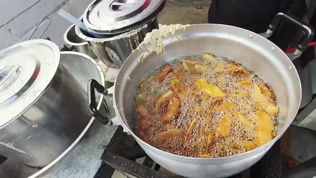 สงขลา-วันขึ้นปีใหม่ กล้วยทอด “ป้าอร”เจ้าอร่อยหน้าทางเข้าสวนสัตว์สงขลาที่ใช้หม้ออะลูมิเนียมทอดแทนกระทะ แจกกล้วยทอด ให้ลูกค้ากินฟรี