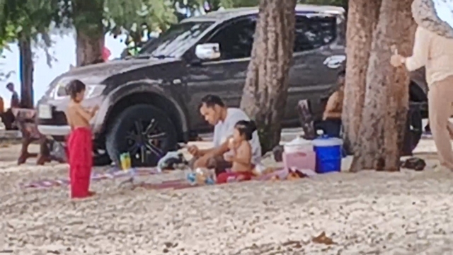 ในวันนี้สภาพอากาศร้อน บริเวณชายหาดเด็กๆลงเล่นน้ำทะเลในเวิ้งอ่าวคลายร้อนกัน เนื่องจากน้ำบริเวณนี้ไม่ลึก และไม่มีคลื่นลม มีนักท่องเที่ยวพาครอบครัวเดินทางมาท่องเที่ยวลงเล่นน้ำทะเลกันอย่างสนุกสนาน