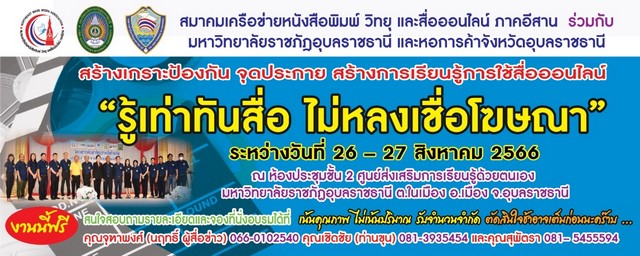 “สื่อออนไลน์ ดาบสองคม” ส.นวอ.อีสาน จับมือ มรภ.อุบลฯ และหอการค้าอุบลฯ สร้างเกราะป้องกัน จุดประกาย “รู้เท่าทันสื่อ ไม่หลงเชื่อโฆษณา”