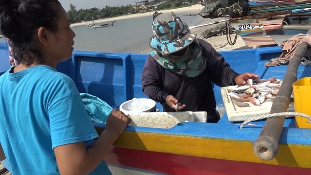 สงขลา-เรือประมงพื้นบ้านวางลอบปู หยุดทำการประมงนำลอบปูกลับขึ้นฝั่ง จอดเรือบนชายหาดทำความสะอ…