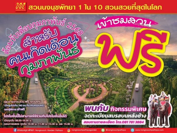 สวนนงนุชพัทยาจัดโปรใหญ่เดือนแห่งความรัก ผู้ที่เกิดเดือนกุมภาพันธ์ เข้าฟรีทั้งเดือน …