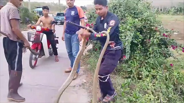 จงอางยาวเกือบ 4 เมตร เลื้อยมาอยู่หน้าบ้าน ผวารีบแจ้งทีมอสรพิษฯมาจับ
