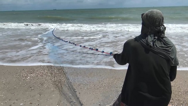 สงขลา-สองหนุ่มใช้เวลาว่างวันหยุดสุดสัปดาห์สร้างรายได้ นำอวนมาลากจับปลากระบอกบริเวณชายหาดชล…
