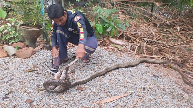 สงขลา-ทีมปราบอสรพิษอาสาพิทักษ์งู จ.สงขลาจงอางยาว 3.10 เมตร เสียท่าถูกเหลือม 2 เมตรกว่ารัดค…